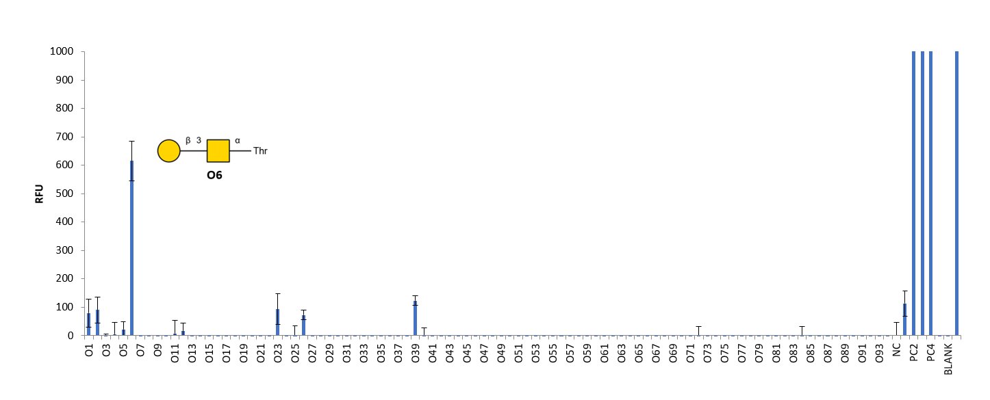 Binding profile of the humanized monoclonal antibody NEO-201 against an O-glycan microarray consisting of multiple O-glycan structures (O1–O96). Strong binding was observed to glycan O6, corresponding to the core 1 O-glycan (T antigen; Galβ1-3GalNAcα-Thr), while most other glycans showed minimal or background-level signals. Positive control spots (PC) produced strong fluorescence signals, confirming assay performance, while negative controls remained low. Data are reproduced from Tsang et al. (2022), which utilized our O-glycan microarray platform to identify the glycan epitope recognized by NEO-201.